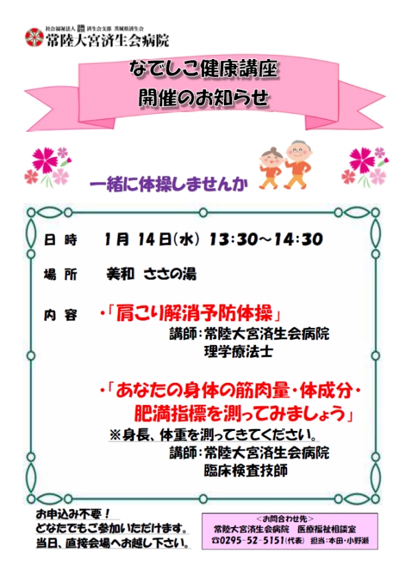 お知らせ 1月なでしこ健康講座 開催のお知らせ 2025.11.27 下記の日程でなでしこ健康講座を開催します。 日 時 2026年1月14日(水) 13:30~14:30場 所 :美和 ささの湯内 容: 「肩こり解消予防体操」 講師:当院 理学療法士 「あなたの身体の筋肉量・体成分・肥満指標を測ってみましょう」 ※ご来場前に身長、体重測定をお願い致します。 講師:当院 臨床検査技師 お申込み不要! どなたでも ご参加いただけます。当日、直接会場へお越し下さい。 12月なでしこ健康講座 開催のお知らせ 前の記事