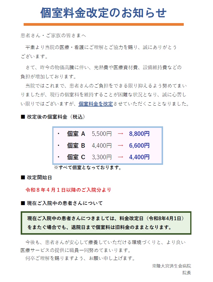 現在ご入院中の患者さんにつきましては、料金改定日(令和8年4月1日)をまたぐ場合でも、退院日まで個室料は旧料金のままとなります。
